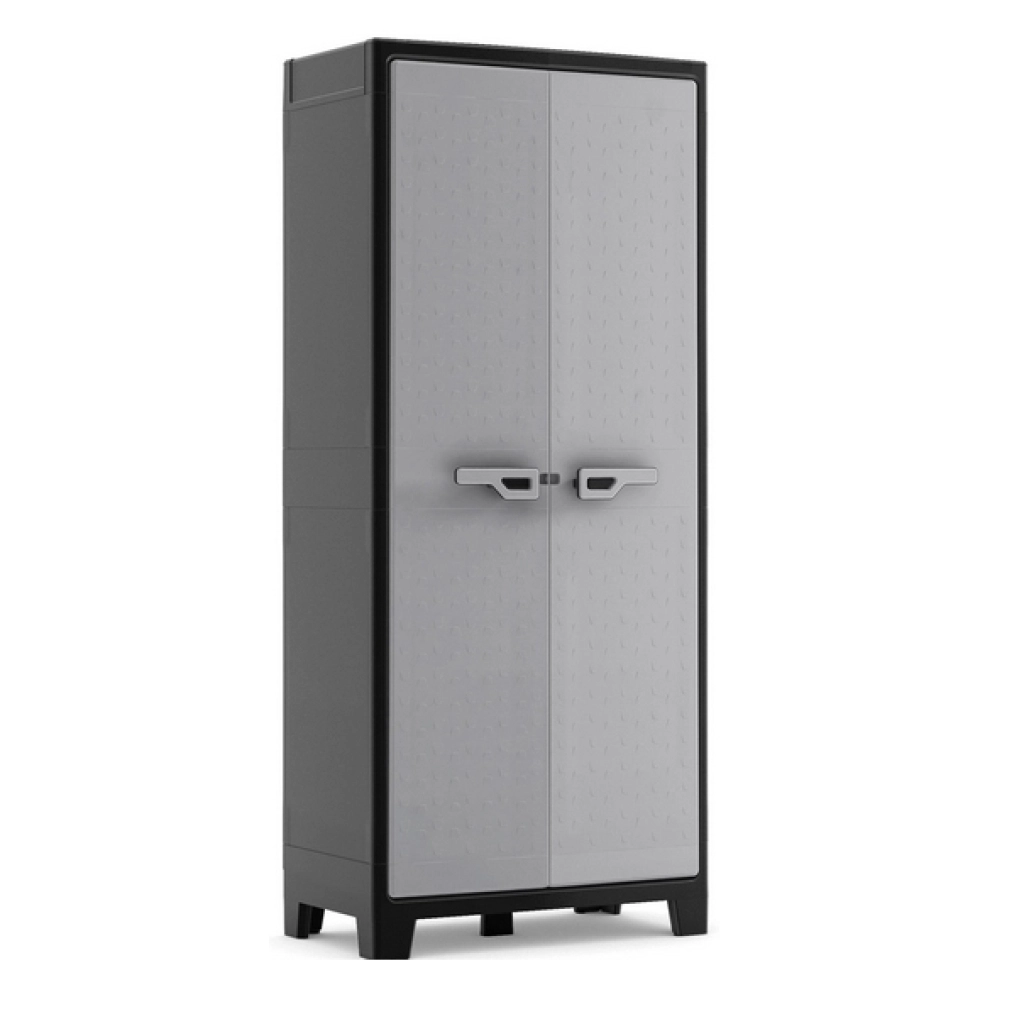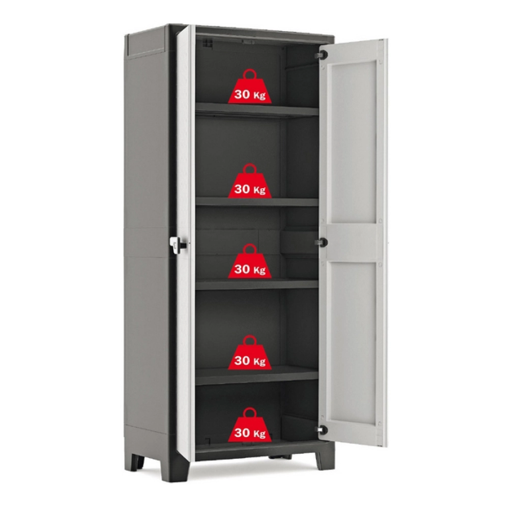 Материал: пластик. Шкаф с двумя дверцами, петли с доводчиком. Проушины для навесного замка. Оснащен 5 полками. 4 регулируемые по высоте . Регулируемые по высоте ножки. Шкаф универсальный подойдет как для бытовых помещений, так и для дачи. Нагрузка на полку до 30 кг.