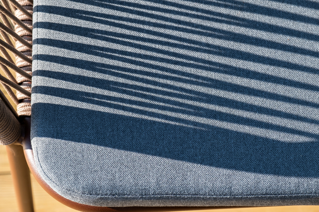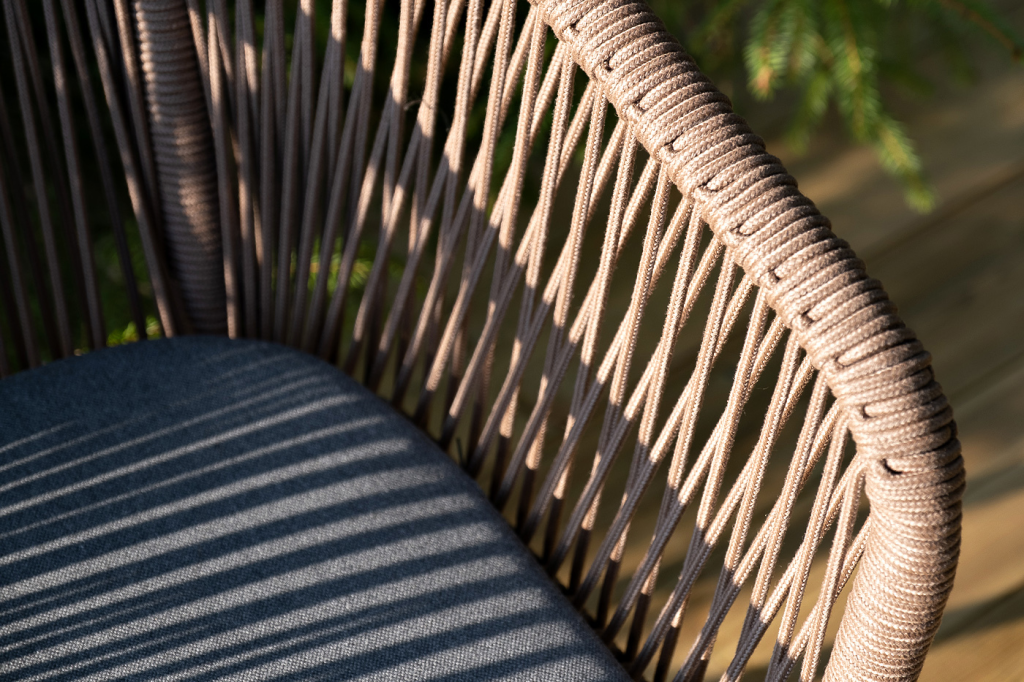 Стулья оснащены алюминиевым каркасом, которые вручную оплетены плоским роупом коричневого цвета.