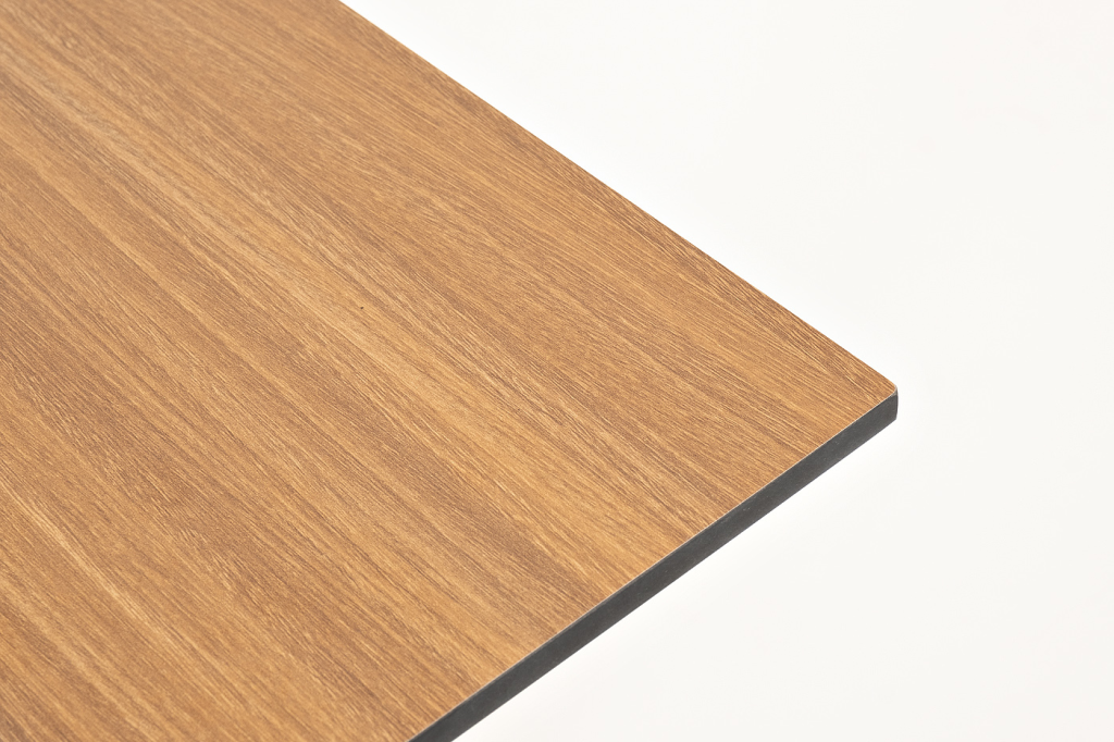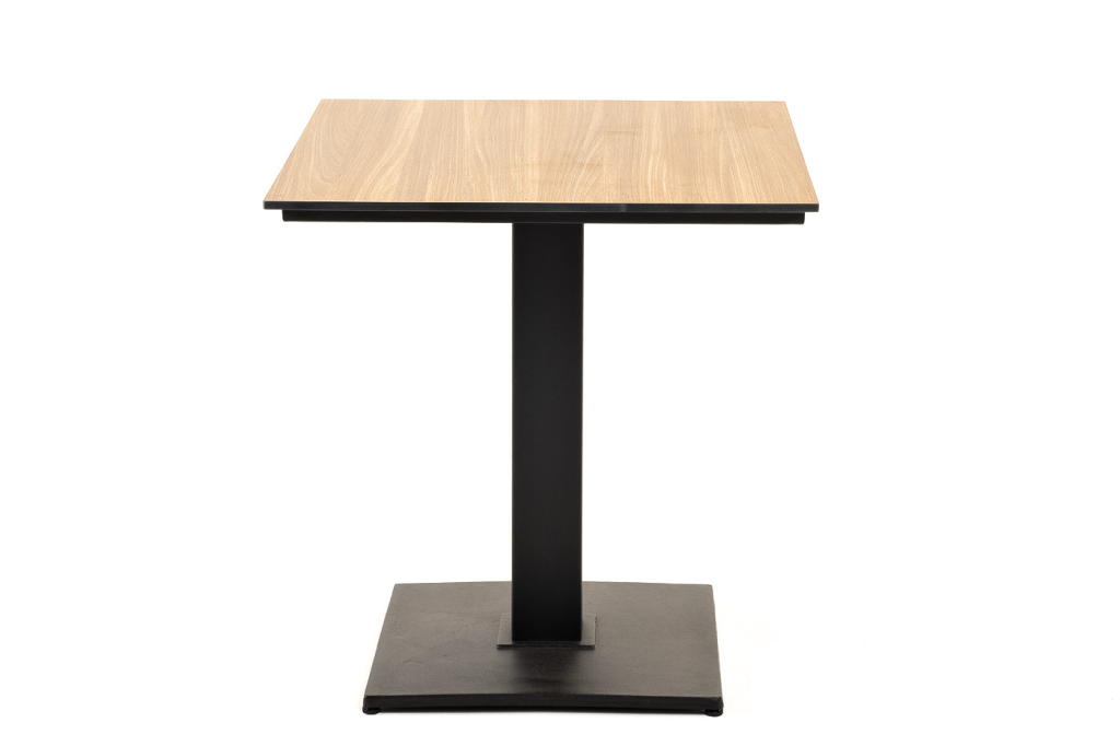 Интерьерный стол изготовлен из металлического подстолья, окрашенного в черный цвет, и столешницы из компактного пластика HPL в цвете «дуб». Благодаря массивному основанию столик устойчив на любых поверхностях.